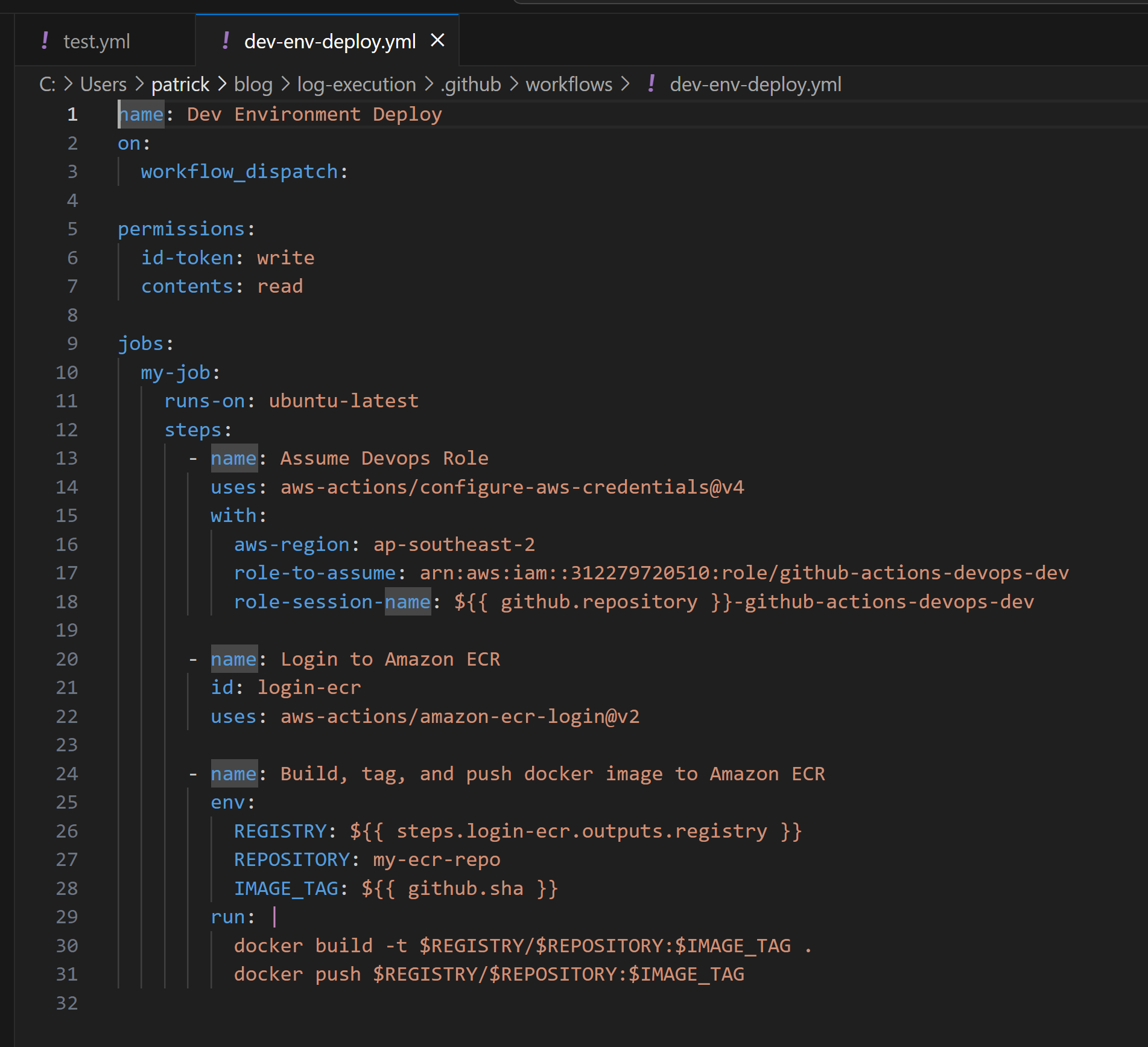 The "Dev Environment Deploy" workflow for the "log-execution" repository had the same permissions configured as the "hello-world" repository's workflow. Despite not making use of secrets, the workflow was making use of the "aws-actions/configure-aws-credentials" action to assume the "github-actions-devops-dev" role and then subsequently interact with Amazon Web Services (AWS) Elastic Container Service (ECS). If it was possible to inject code into the repository or manipulate the workflow, it would be possible to compromise the "github-actions-devops-dev" role and the resources it had access to.