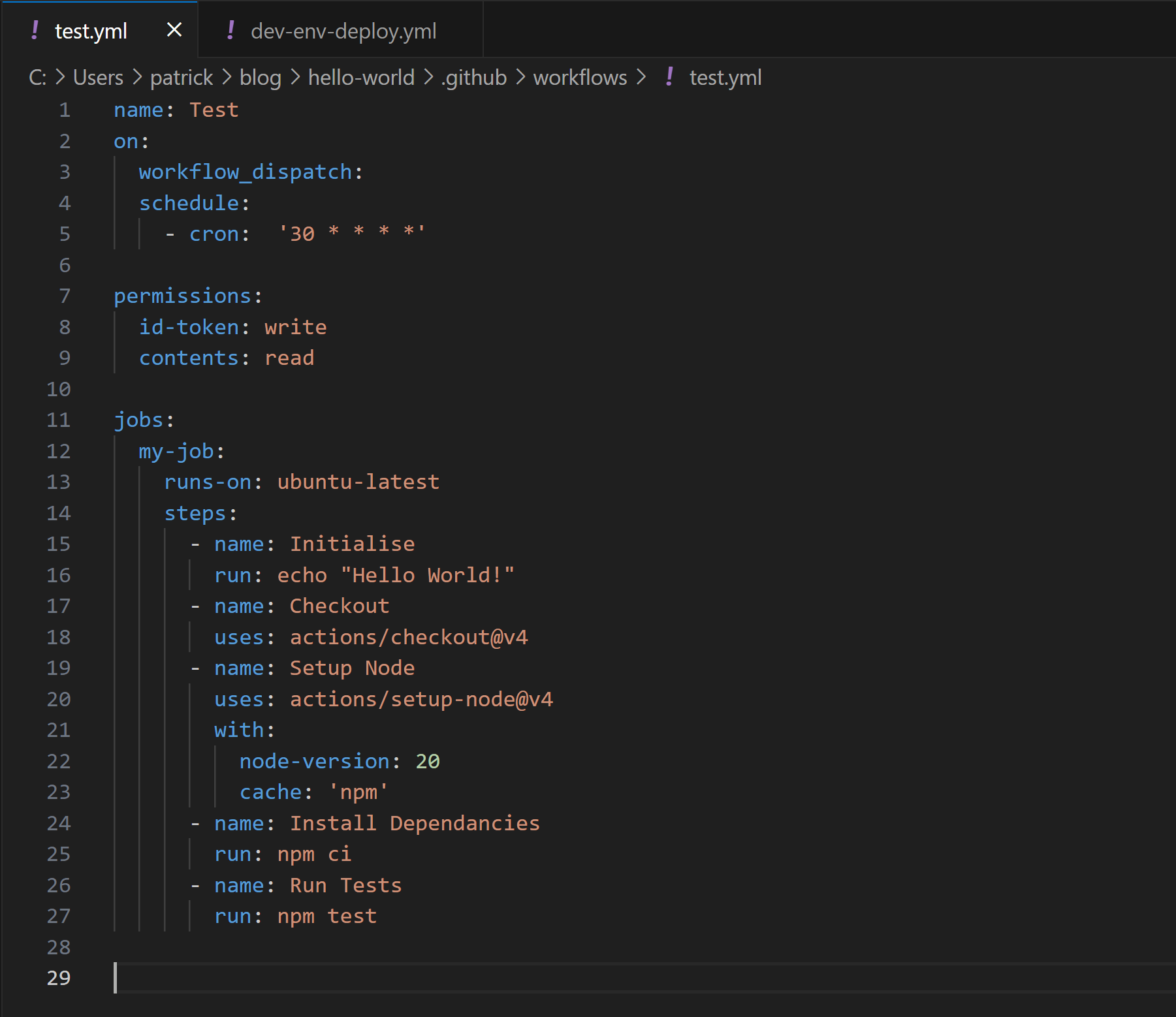 The "Test" workflow for the "hello-world" repository was configured to use the GitHub hosted runners and did not make use of any secrets. The workflow had also been configured with the permissions "id-token: write" and "contents: read". The "id-token: write" delegates the runner with the privileges to retrieve an Open ID Connect (OIDC) token from GitHub's OIDC service. By reviewing the actions in the workflow it was determined that this permission was not required for it to function correctly and may be an artifact of an older version of the workflow. The "contents: read" permission provides the "GITHUB_TOKEN" secret injected into the runner, with permissions to access the repository with read permissions. This is required for the "actions/checkout" action within the workflow.