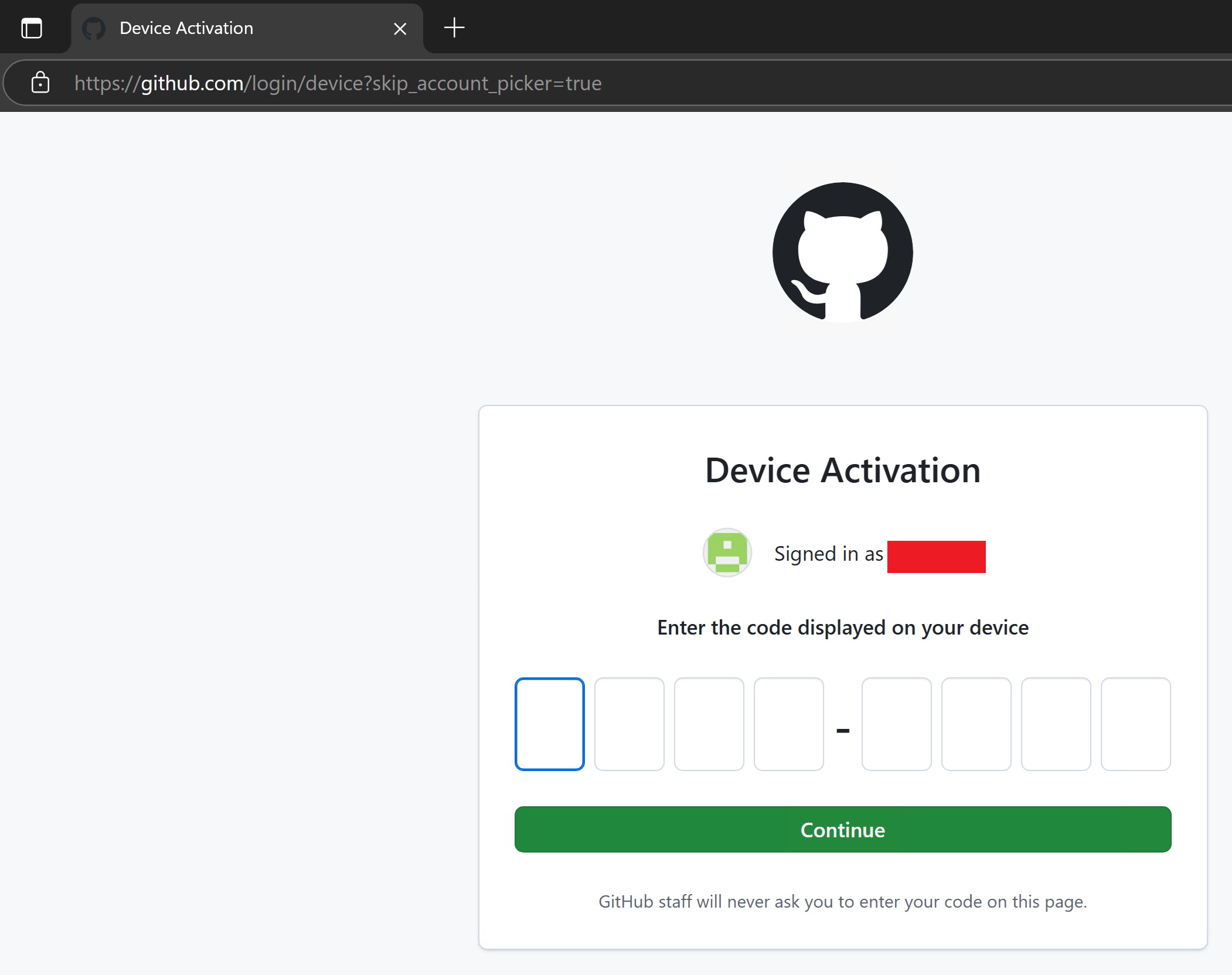 Upon accessing the landing page, JavaScript would poll the Flask application to have a device code generated and then update the page. The page also included instructions redirecting the user to enter the code in a web browser. If the user navigated to the legitimate GitHub IdP, they were prompted for their code.