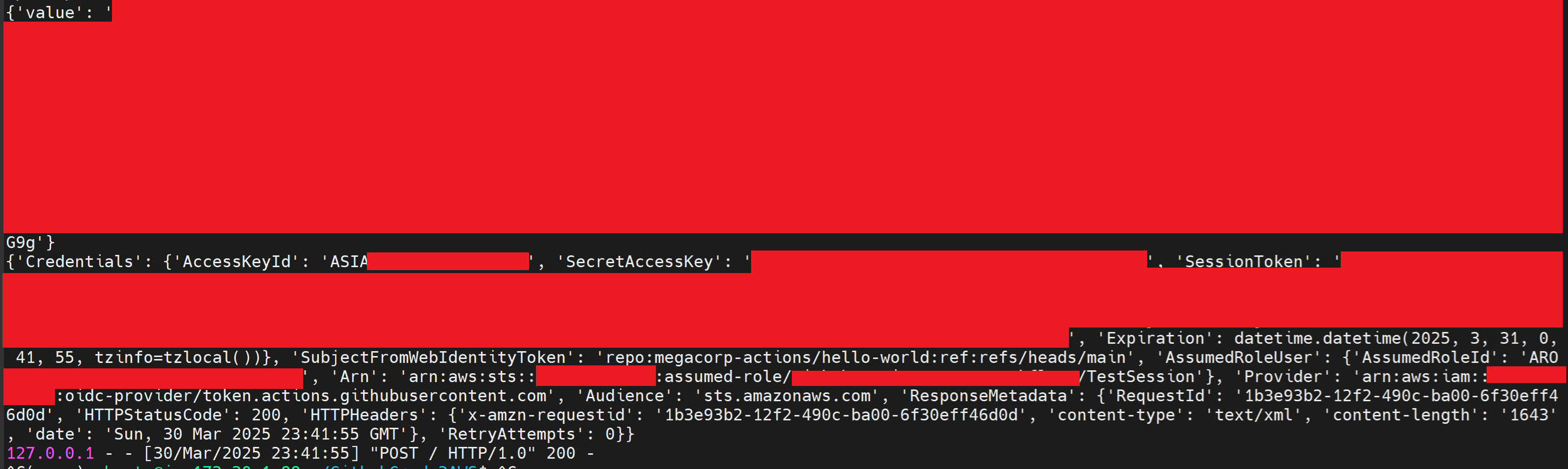 To deal with the short life span of the token (valid while the workflow is executing) used to authenticate to GitHub's OIDC service and the inconsistent timing of executions on GitHub hosted runners, a Flask application with a single API was created. Upon receiving a POST request containing a runner's environment variables, the application would request a JWT from GitHub's OIDC service and if successful, authenticate to AWS's STS service to assume a role and gain access to an "AccessKeyId", "SecretAccessKey" and "SessionToken".