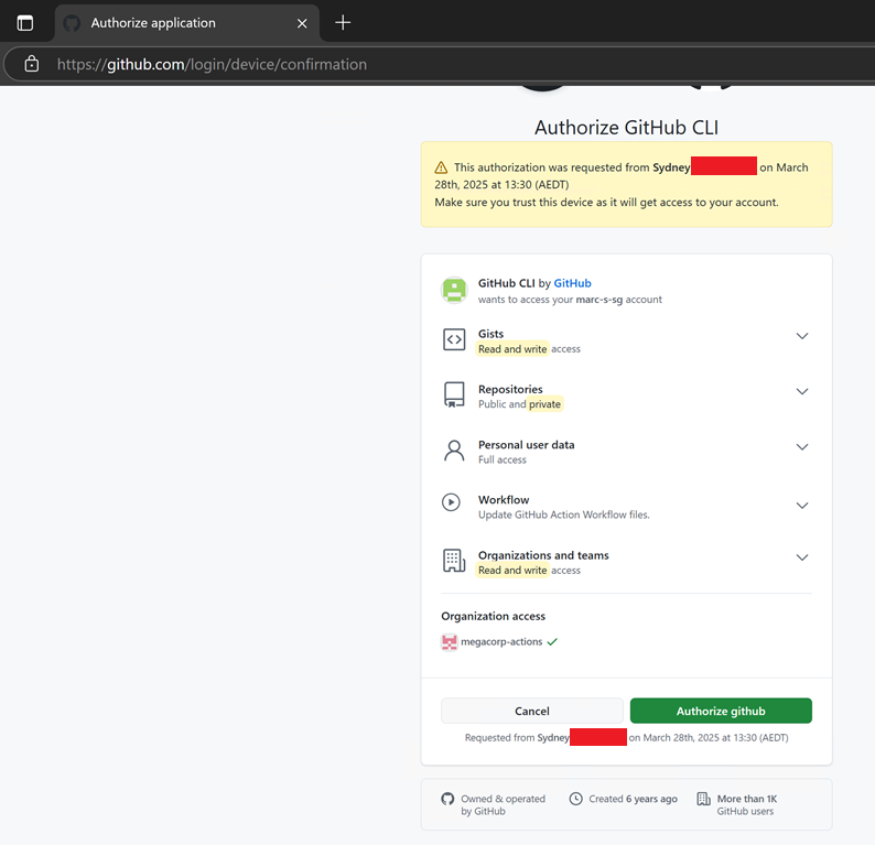 After entering their code, GitHub provides a warning prompt disclosing the application executing the DFA and the scope requested for the token.