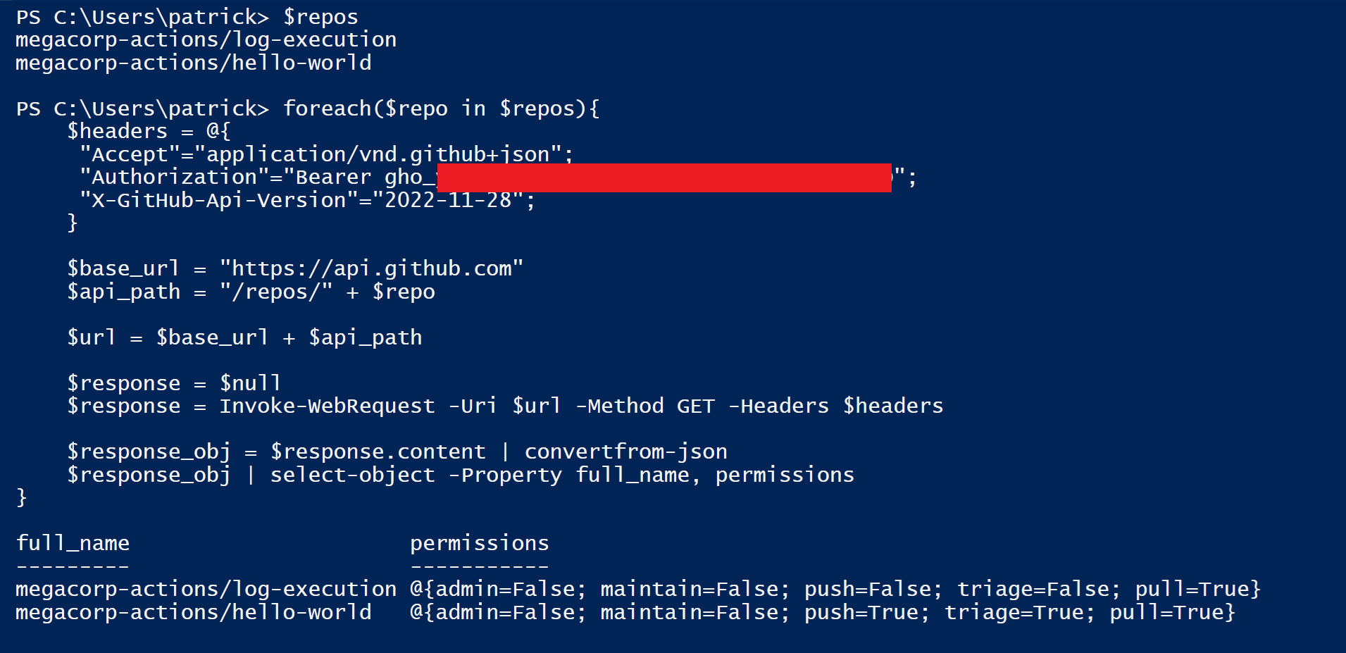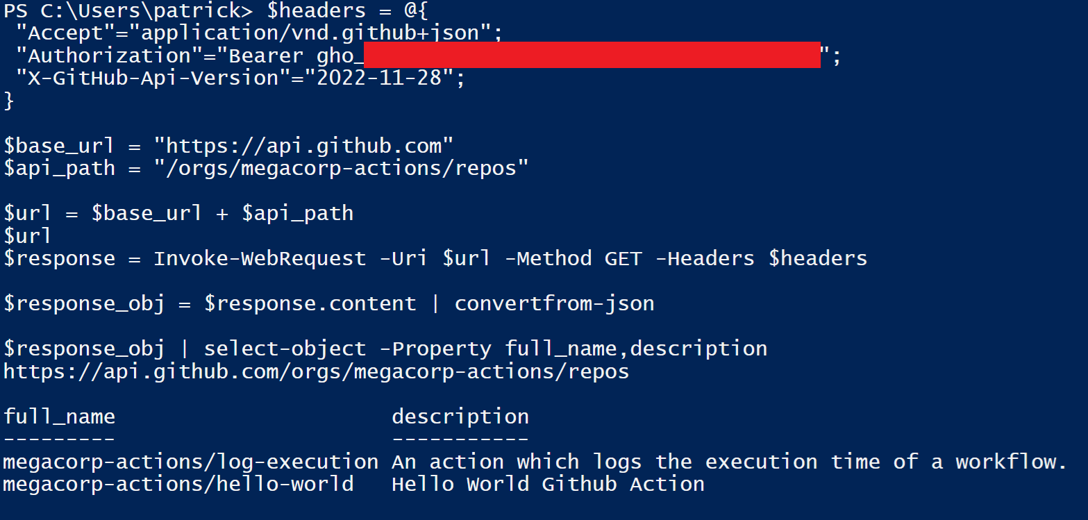 Reconnaissance could then be performed by using the token to make authenticated requests to GitHub's API and pulling repositories using the Git client. While ad hoc PowerShell commands were used for this example attack path, Brett Hawkin's SCMKit (https://github.com/h4wkst3r/SCMKit) for attacking Source Code Management systems would have been a good option as well.