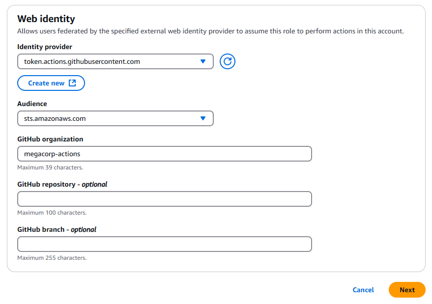 At the time of writing, the AWS console required an organisation be provided when configuring trusts, preventing the previously described misconfiguration (in the web console, using the "wizard"). However, the repository and branch fields are optional. When configured without a specific repository or branch, workflows for any repository in the organisation can assume the role that the trust is configured for. This configuration does not have the same impact as the misconfiguration highlighted in the DataDog blog, but it does provide a potential avenue to compromise AWS roles from unprivileged GitHub repositories within the organisation.