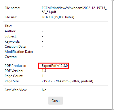 Historically this has led to server-side request forgery (SSRF), including the ability to obtain access into the AWS environment and the ability to read local files on the server. This case is no exception, one of the document properties of the PDF tells us what software library (Expert PDF v12.3.0) was used to generate the PDF.