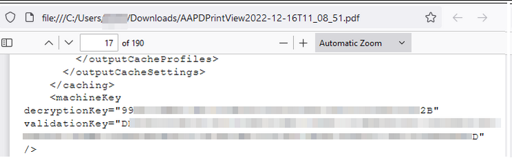 Within the configuration file, were the decryption and validation key values for what is termed the MachineKey: