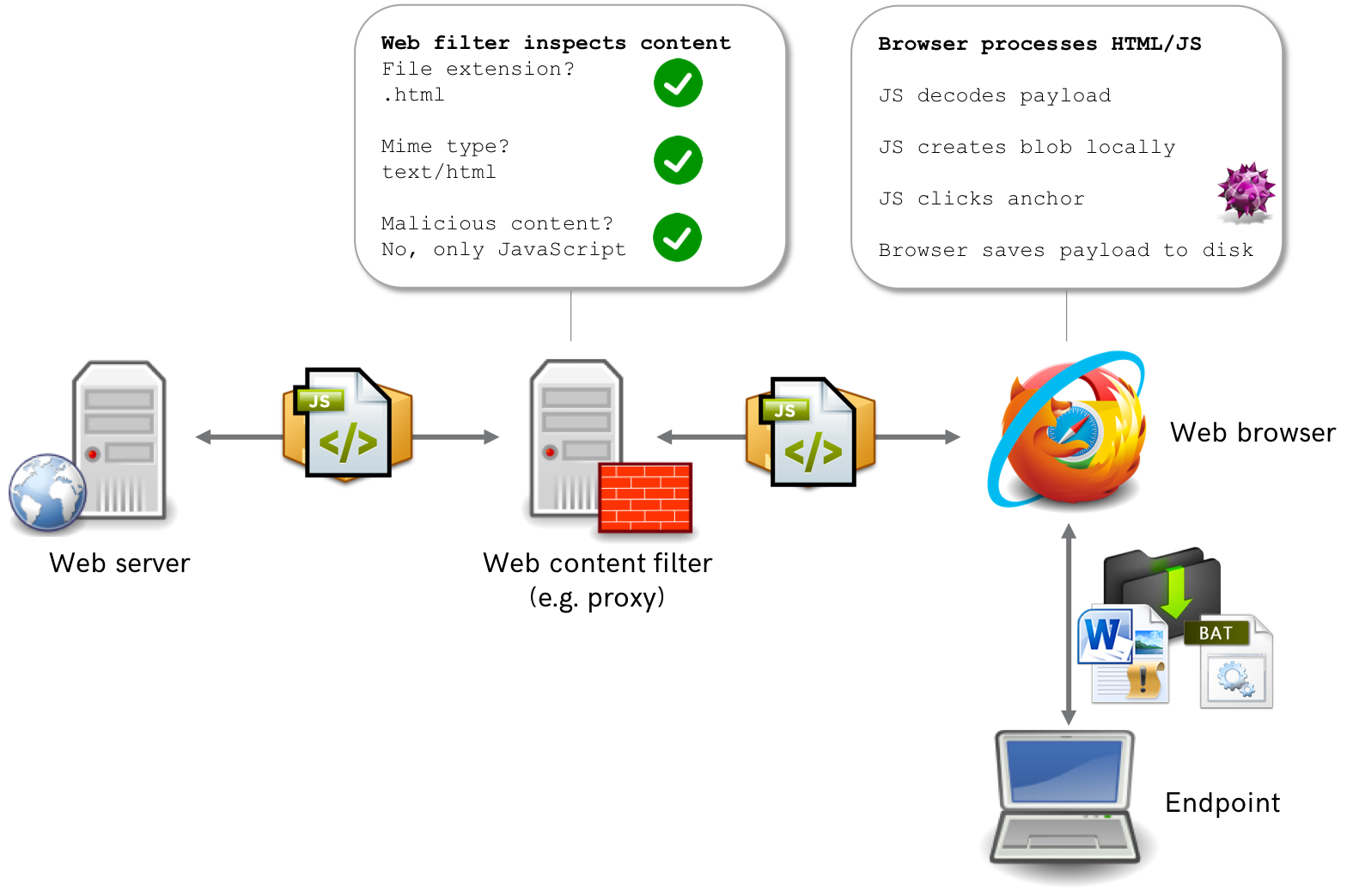 To bypass HTTP proxies configured to block specific file types, HTML Smuggling (https://attack.mitre.org/techniques/T1027/006/) could be used to deliver payloads from within the third component. HTML Smuggling is a technique which involves embedding the data and name of a file in client-side resources (HTML, JavaScript, CSS etc.) and then using JavaScript API to have the browser "download" the file. As no outbound requests are made for blocked file types (i.e. those used for initial access: .hta, .exe, .vbs etc.), the proxy does not have the capability to block delivery. The folks at Outflank have an excellent blog (https://www.outflank.nl/blog/2018/08/14/html-smuggling-explained/) that details how HTML smuggling functions which is available here: