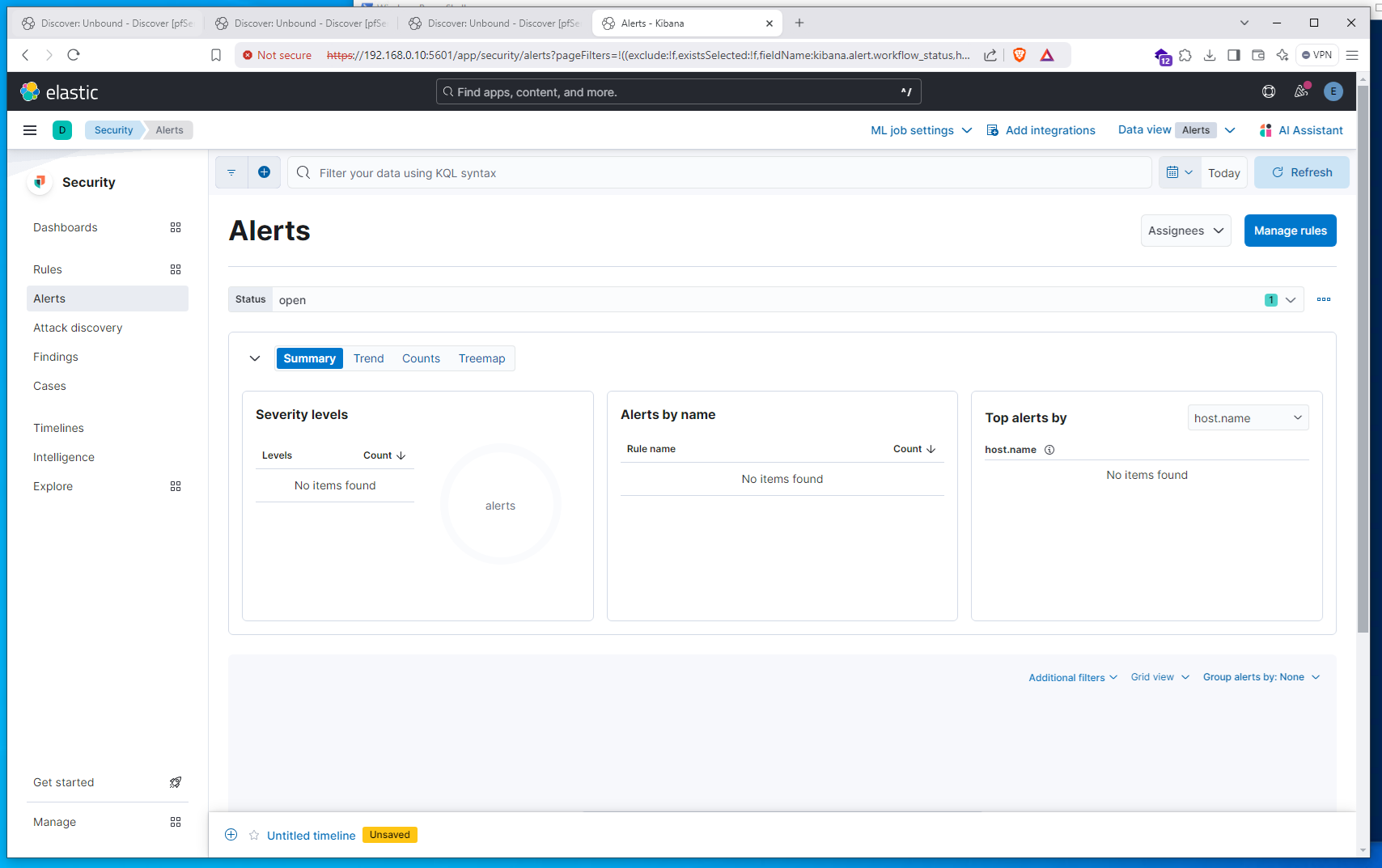 After implementing the new alerts, the test was executed again. This time, two alerts were raised in the Elastic Security alert dashboard indicating they were working as expected.