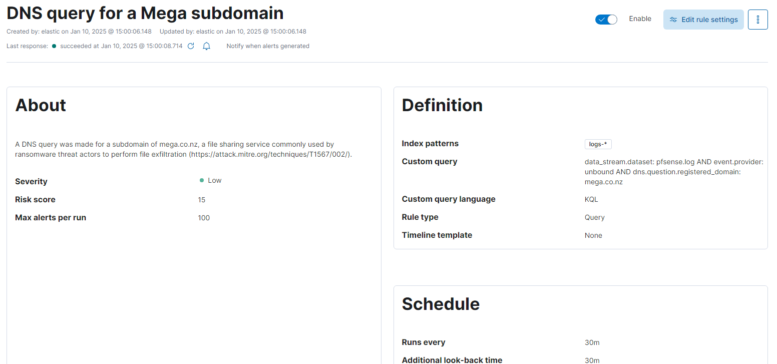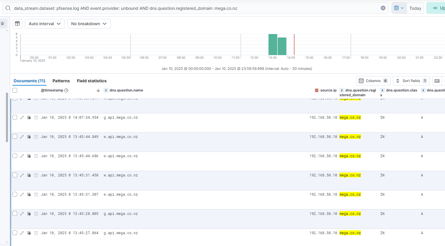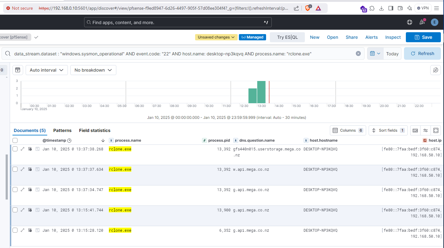To detect use of the MEGA service regardless of the tool used, a query was defined to identify any DNS lookup events where the registered domain was "mega.co.nz". The logs from the firewall were used for this query, rather than those produced by Sysmon. This would ensure detection of network connections to MEGA's services, even if Sysmon was not deployed to the endpoint where the technique was performed.