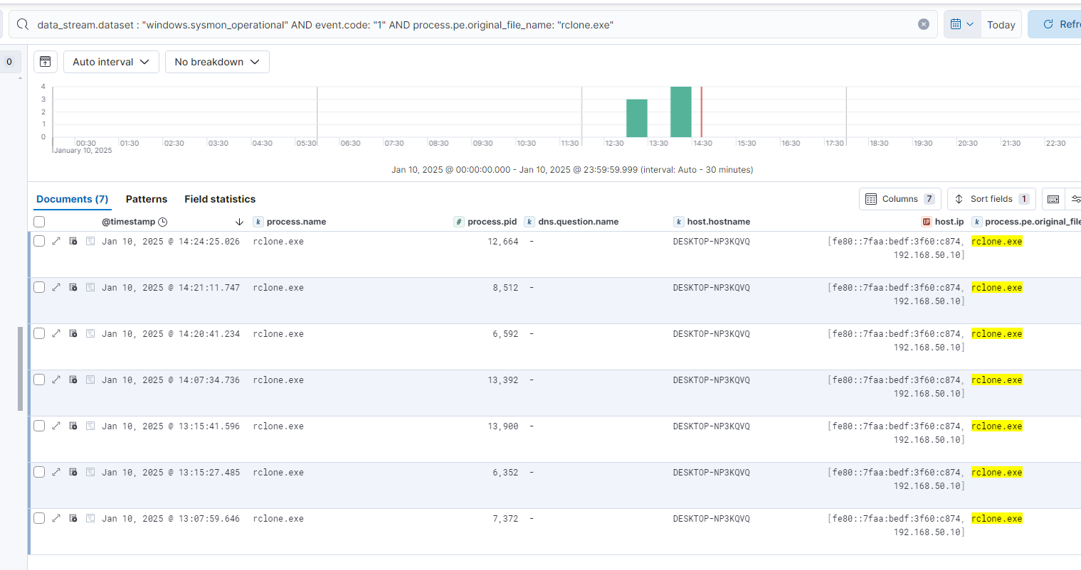 To detect the use of RClone on the endpoint, a query for Sysmon process creation events was drafted which identified any events where the portable executable had an original file name of "rclone.exe". The original file name is a more ideal target for detection as it is slightly harder to modify when compared to the file name. Additionally, if the original file name is modified and the portable executable is signed, the signature will become invalid.