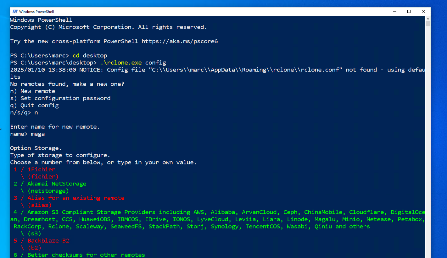With a MEGA account created, the RClone client (https://rclone.org/downloads/) was downloaded to the test system and the documentation reviewed to determine how RClone's MEGA (https://rclone.org/mega/) features could be used. The documentation details the process for configuring a MEGA account for use with the "config" command. This command caches credentials for use in subsequent commands.