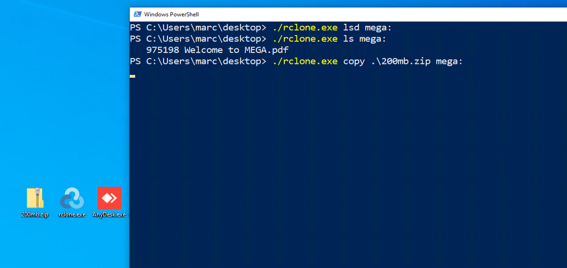 Once the credentials were configured, the copy command was used to perform the exfiltration by uploading the sample file to Mega.