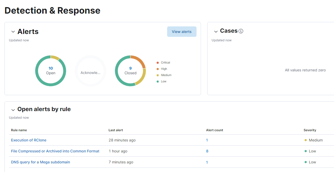After implementing the new alerts, the test was executed again. This time, two alerts were raised in the Elastic Security alert dashboard indicating they were working as expected.