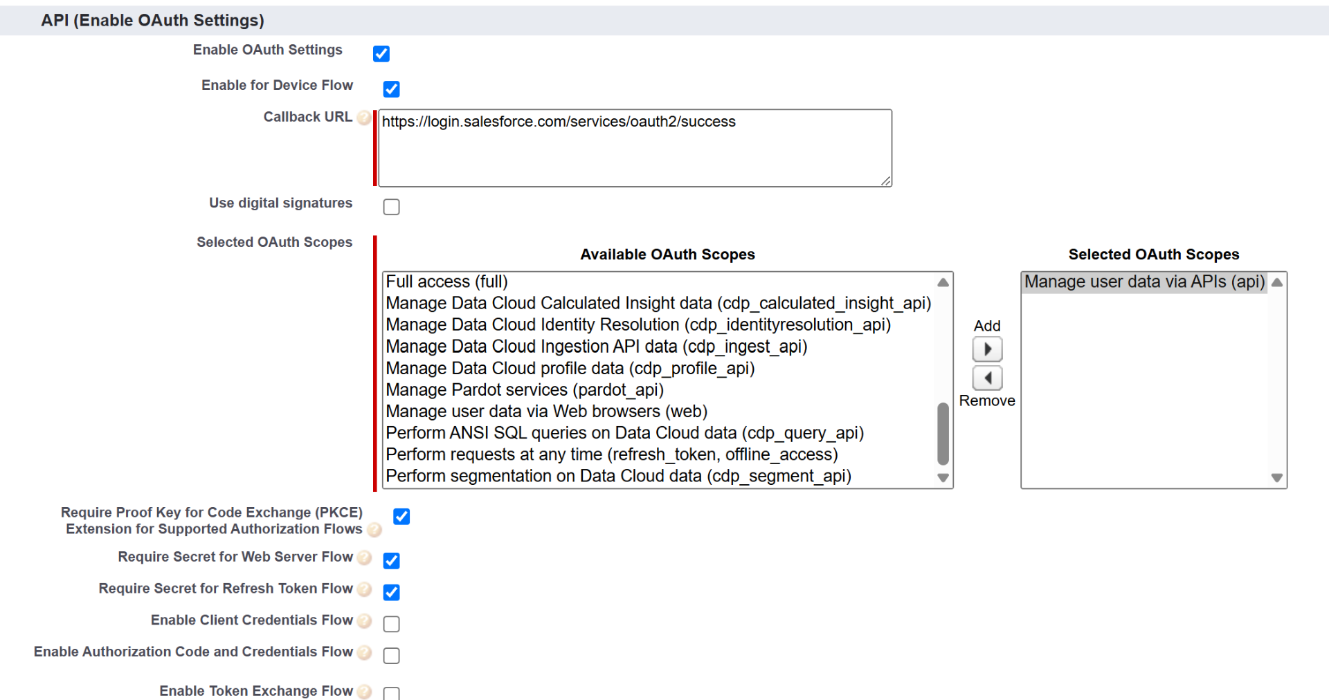 So that the application can use the DAF, "OAuth Settings" need to be enabled in addition to the "Device Flow".