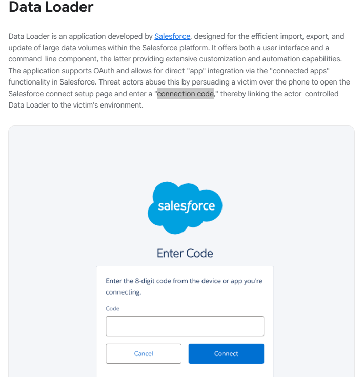 In their article, Bleeping Computer reference a report (https://cloud.google.com/blog/topics/threat-intelligence/voice-phishing-data-extortion) by Google's Threat Intelligence Group (GTIG) which documents how a group (ShinyHunters) they track as UNC6240 were using the Salesforce Data Loader application (https://developer.salesforce.com/tools/data-loader) during their vishing attacks. GTIG describe that UNC6240 were socially engineering targets to browse to a "Salesforce connect setup page" and enter a "connection code". It also included a screenshot of the setup page.