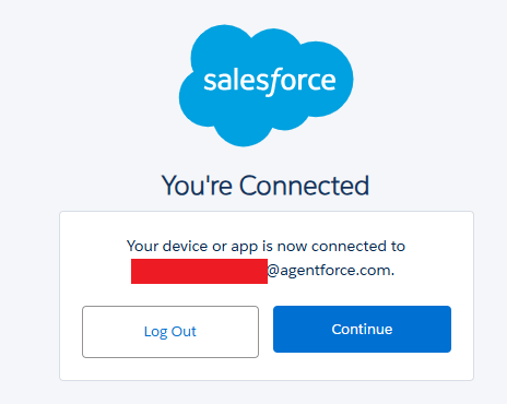 If the user navigates to the URL, they get the same initial connection page seen for the Data Loader application. If they were to submit the code, they would then get taken to the final prompt, which includes the Connected Application name and the logo specified during creation.