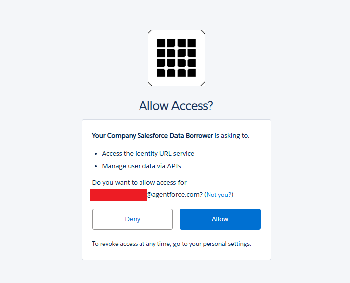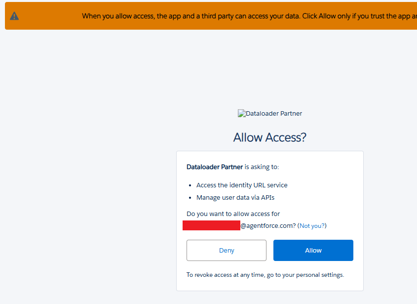 If the user was already logged into Salesforce, they would get a final prompt with the access requested in the initial DAF request scopes. If they were not logged on, they would be prompted to authenticate. At the time of writing this blog, the application logo for the Data Loader application was not loading correctly from the referenced S3 bucket.
