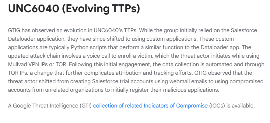 When it came time to draft this blog, we noted that Google had updated their report on the abuse of the Data Loader application. Their update described that ShinyHunters had moved away from the use of the Data Loader application and had started using their own connected applications. It is fair to assume that this adaptation was due to Google issuing advice to look for rogue registrations of the Data Loader application.