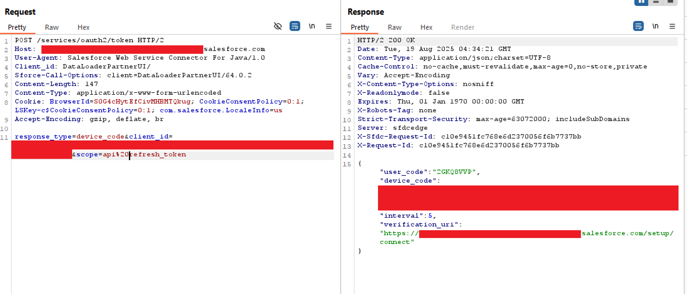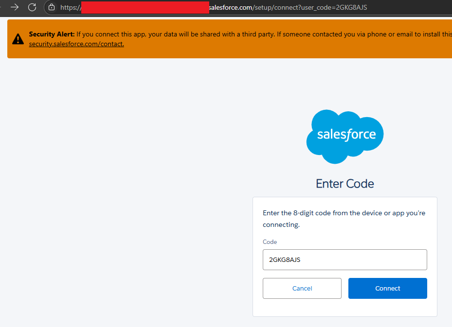 As suspected, the next authentication attempt used DAF, which was successful. The application also opened the default browser with the user code pre-populated from the URL parameter "user_code". It was noted that some time after we developed our initial proof of concept at the start of August, Salesforce added a warning banner to the setup page to warn users against entering codes provided to them over the phone or by email.