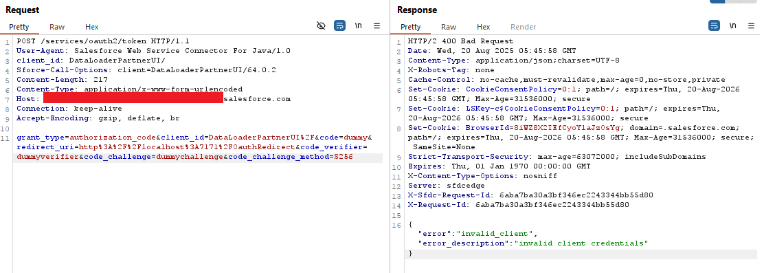 The application initially attempted to perform authentication using the OAuth authorisation code flow with dummy values. However, an error response from the server indicated the default client provided by the application was not valid.