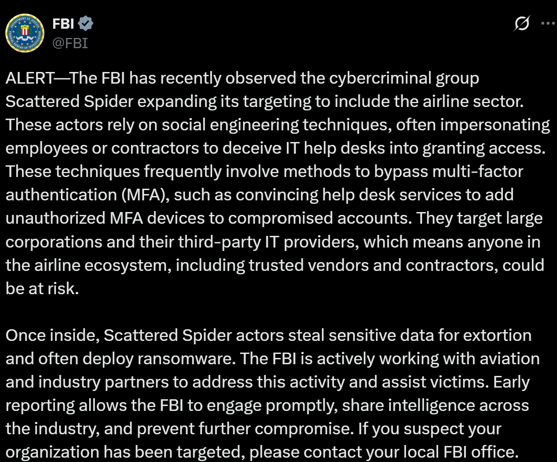 Just days before Qantas' announcement the FBI had published an alert about a group known as Scattered Spider which was actively targeting the airline sector. As the Tactics, Techniques and Procedures (TTP) historically used by Scattered Spider had similarities with Qantas' breach notification, the media (https://www.abc.net.au/news/2025-07-02/qantas-cyber-attack-significant-data-stolen/105484720) started to join dots and draw conclusions.